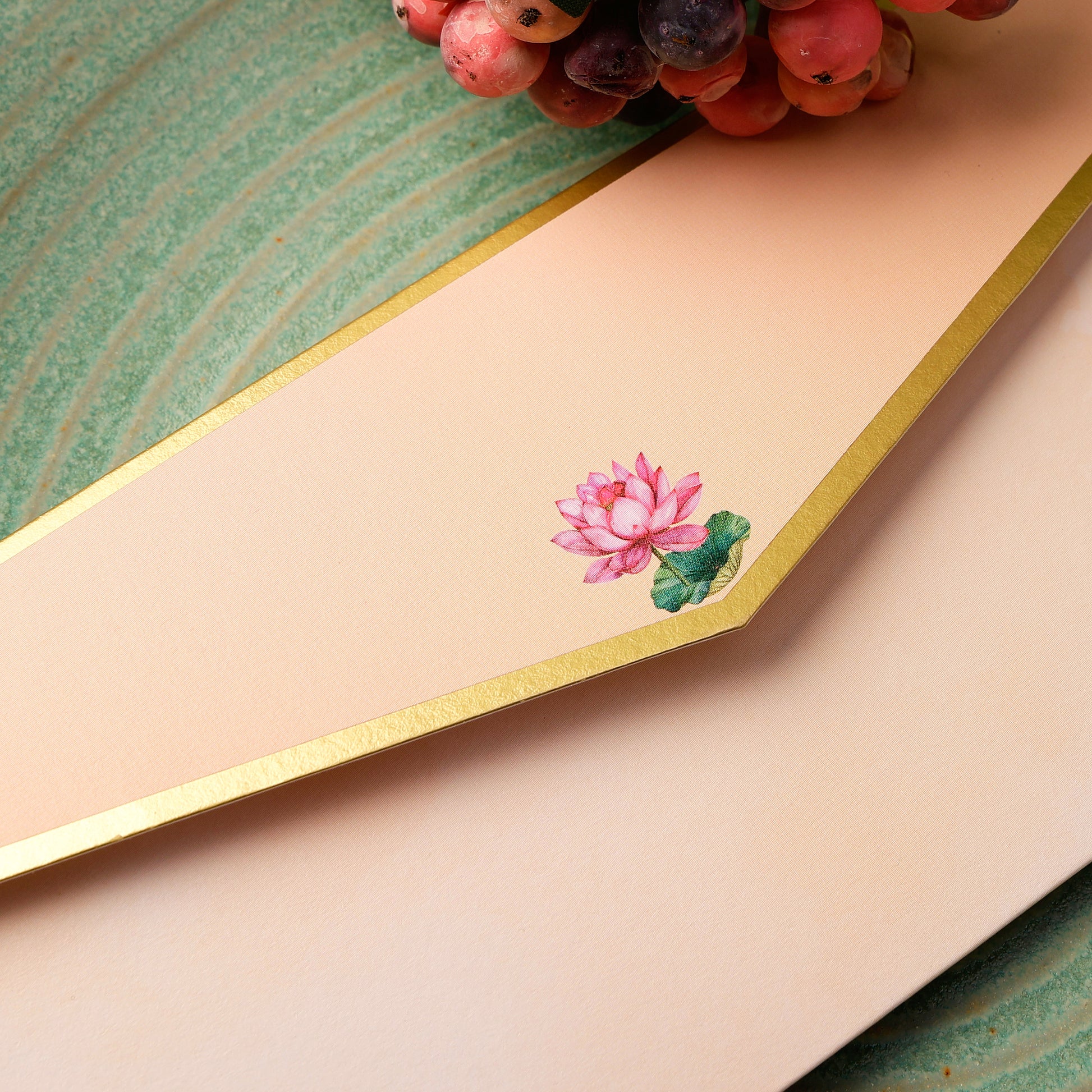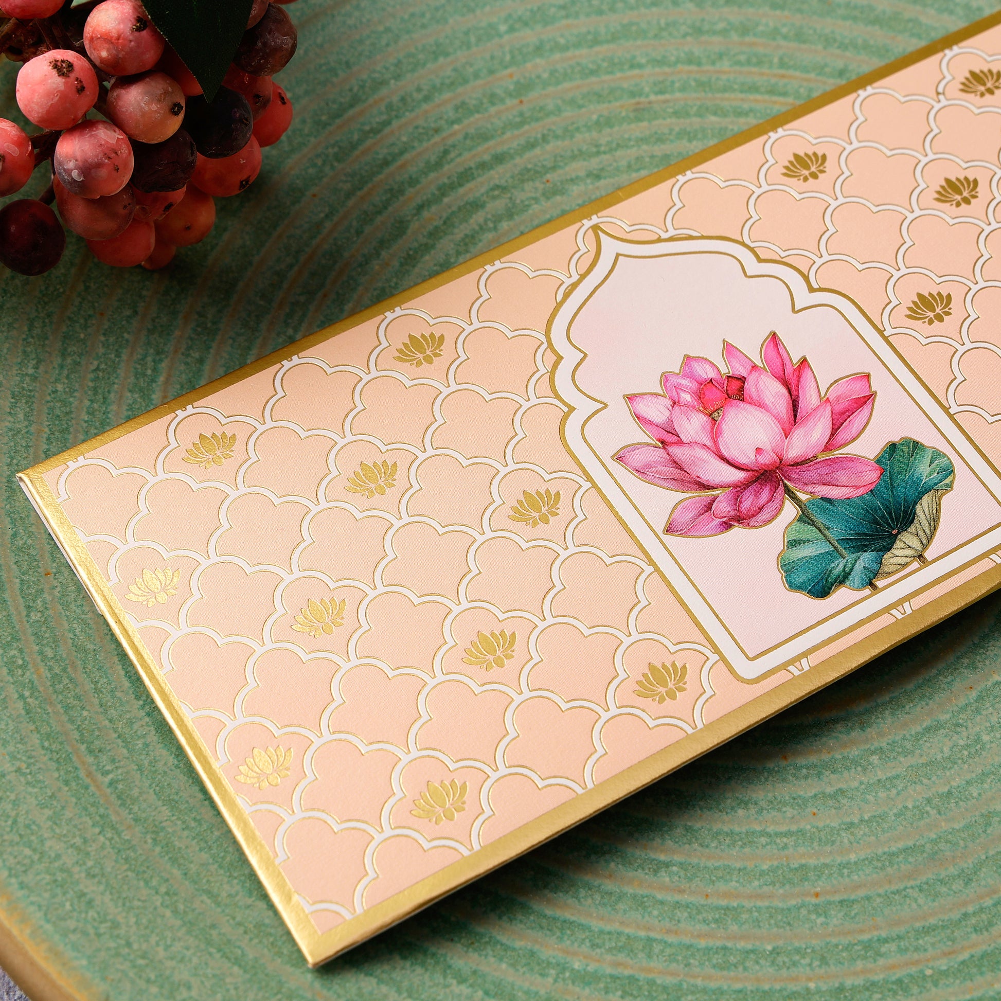Set against a soft peach backdrop, the envelope features a delicate scallop pattern brought to life with shimmering gold foil accents—creating a texture that feels exquisitely luxurious. At the centre sits a beautifully illustrated lotus, echoing the elegance while keeping the overall look modern and serene.